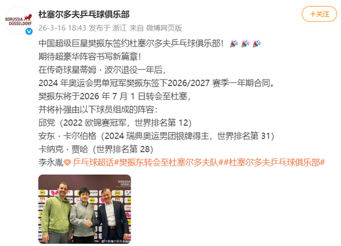 3月16日,杜塞尔多夫乒乓球俱乐部官宣樊振东加盟: